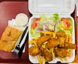 Indulge in our mouthwatering chicken finger dinner featuring five crispy fingers served with a side of fries and salad. Or, customize your sides to your liking with options such as onion rings, rice, or double portions for a meal tailored just for you.