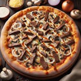 Our red pizza sauce, steak, white onion ,mushroom, green peppers, cheese.