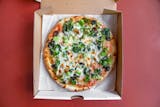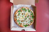 Red or white sauce with grilled chicken, broccoli, fresh garlic, and mozzarella cheese.