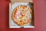 Pepperoni, sausage, ham, hamburger, bacon, red sauce, and mozzarella cheese.
