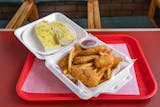 Batter-fried fish and crunchy French fries with the traditional accompaniments of tartar sauce & malt vinegar.