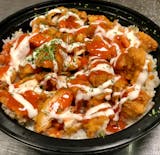Buffalo fried chicken with ranch dressing and parsley over rice