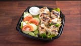 Two skewers of chicken breast, peppers, onions, and tzatziki sauce with a choice of Fries or Rice, served with a side salad.