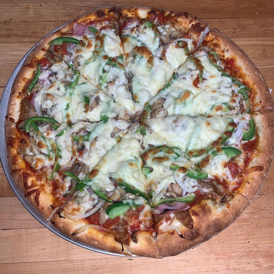 Onions, green peppers, mushroom, Hamburg, pepperoni, Italian sausage, imported ham, sauce, mozzarella & cheddar.