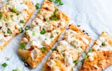 Crisp flatbread, chicken, shredded cheese, bbq sauce, topped with crispy onion rings.