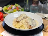 Pan-fried chicken, mushrooms, capers, fresh lemon, white wine garlic butter sauce served with a side of pasta