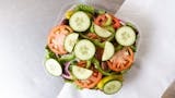 Mixed lettuce, green peppers, tomatoes wedges, red onions, cucumbers, Kalamata olives, pepperoncini, feta cheese, Served with a side of house dressing.