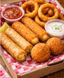 a few of our most popular side dishes ( 2 mozz sticks, 2 potato cigars, onion rings, and 2 mac and cheese balls)