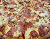 Pepperoni, sausage, mushrooms, ham, onion, green peppers, black olives & oregano.