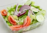 Fresh lettuce, tomatoes, green peppers, red onions, cucumbers, and black olives.