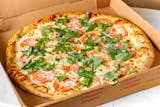 Minced garlic, Roma tomatoes, olive oil, fresh basil, parmesan & mozzarella cheese. Pizza sauce optional.