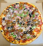 Pepperoni, sausage, ham, bacon, onions, tomatoes, green peppers, black olives, sweet peppers, mushrooms.