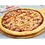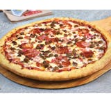 Pizza sauce with pepperoni, italian sausage, ground beef, italian salami, ham, bacon, and an extra topping of our signature cheese blend.