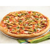 Pizza sauce with grilled chicken, tomatoes, green peppers, onions, jalapeno peppers, and our signature cheese blend, sprinkled with fajita seasoning.