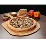 Vegetarian. Pizza sauce with mushrooms, green peppers, tomatoes, onions, black olives, and an extra topping of our signature cheese blend.