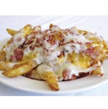Crispy French fries topped with our special blend pizza cheese, cheddar cheese and bacon crumbles.