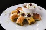 "Baklava" Over 50 layers of hand-stretched phyllo dough layered with toasted pistachios and butter, then gently baked to golden brown slightly crisp on the outside, and smothered in lemon sugar syrup. Served with whipped cream.
