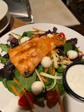 Grilled salmon with sweet & spicy honey sauce, fresh greens, red onions, carrots, squash, tomatoes, whole milk mozzarella, ranch dressing.