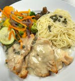 Lemon butter caper sauce, veggie, angel hair pasta.