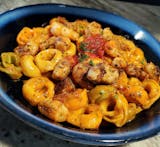 Blackened shrimp, cheese filled tortellini, creamy tomato pesto sauce.