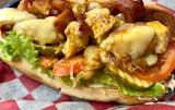 Grilled fresh marinated chicken breast topped bacon, melted cheese (American or provolone), lettuce, tomatoes & mayonnaise.