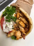 Grilled marinated mix of lamb & beef slices in a flat pita, topped with lettuce, tomatoes, tzatziki sauce, and feta cheese.