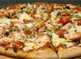 Topped with mushrooms, tomatoes, green peppers, onions, and olives.