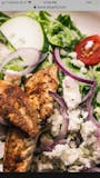 Grilled chicken over tomatoes, cucumbers, onions, green peppers, and olives.