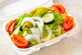 Fresh lettuce, tomatoes, green peppers, red onions, cucumbers, and black olives.
