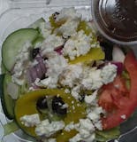 Tomatoes, cucumbers, onions, olives, and feta cheese in an olive oil dressing.