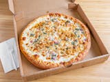 Our secret recipe pizza sauce topped with grilled marinated chicken breast, fresh tomatoes, fresh green peppers, fresh onions, jalapeño peppers, and our special blend of 100% fresh natural cheeses, sprinkled with fajita seasoning.