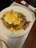 Chicken breast, two poached egg, English muffin, home fries with hollandaise sauce.