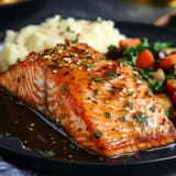 A perfectly roasted salmon fillet, seasoned with herbs and spices, then oven-baked to a tender, flaky finish. Served with a light drizzle of lemon butter sauce and your choice of sides. Fresh, flavorful, and heart-healthy—this dish is as satisfying as it is elegant. Fresh salmon fillet, citrus vinaigrette & two sides.