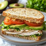 Sliced oven-roasted turkey breast with lettuce, tomato, and mayo on your choice of bread. Served with a side and a drink for a satisfying midday meal.