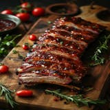 Slow-braised pork ribs with BBQ sauce & two sides. Slow-cooked to perfection, our tender Baby Back Ribs are glazed with a smoky, tangy barbecue sauce, giving you the ultimate melt-in-your-mouth experience. Served with a side of crispy fries and coleslaw for the perfect finish.