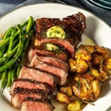 12 oz. NY strip steak with 2 sides. A tender, juicy cut of premium NY strip steak, grilled to perfection and seasoned with our signature blend of spices. Served with your choice of sides for a truly satisfying meal.
