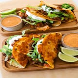 A flavorful classic—your choice of protein (beef, chicken, shrimp, or veggie) tucked into a warm corn or flour tortilla, topped with crisp lettuce, fresh pico de gallo, shredded cheese, and a drizzle of our house-made sauce. Served with a wedge of lime for that perfect finishing touch. Simple, fresh, and packed with flavor.