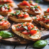 Crispy toasted bread topped with fresh tomatoes, garlic, basil, and extra virgin olive oil—a simple and flavorful taste of Naples.