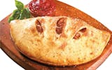 Strombolis are stuffed, baked, and glazed with garlic sauce then sprinkled with Pecorino Romano cheese and served with a side of pizza sauce.