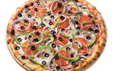 Traditional red pizza sauce and seasoned garlic sauce baked with Italian Sausage, genoa salami, ham, pepperoni, capicola, banana peppers, Wisconsin mozzarella cheese and finished with Pecorino Romano cheese.