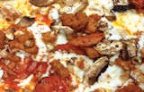 Traditional red pizza sauce and seasoned garlic sauce baked with Italian Sausage, genoa salami, ham, pepperoni, capicola, banana peppers, Wisconsin mozzarella cheese and finished with Pecorino Romano cheese.
