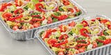 Serves 6-8. Fresh greens with red onions, roasted red peppers, black olives, tomatoes and banana peppers. Finished with feta and Pecorino Romano cheeses.