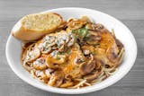 Scaloppini chicken sautéed with mushrooms and Marsala. Served over pasta. Served with a slice of garlic toast.