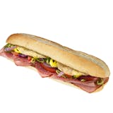 Ham, salami, hot pepper rings, red onion, lettuce, tomato, provolone cheese, and mustard sauce.
