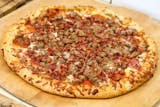 Everything But The Kitchen Sink. Pepperoni, Ham, Sausage, Beef, Bacon, Chicken, Mushrooms, Red Onion, Green Pepper, Banana Peppers, & EXTRA CHEESE. w/ Buffalo & Ranch Drizzle.