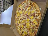 Honey mustard base, crispy chicken, banana peppers, bacon, pineapple, mozzarella cheese, honey drizzled on top.
