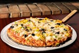 Seasoned taco meat, mozzarella, and cheddar cheese, topped with tomato, lettuce, and black olives with pizza sauce.