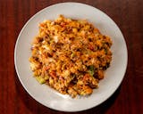 Seasoned ground beef, dorito's, tomato, and shredded cheddar, tossed in Russian dressing.