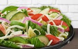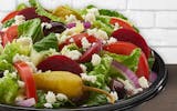 Feta cheese, onions, tomatoes, black olives, pepper rings, peppers, cucumbers, spring mix and Italian dressing.