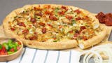 Sarpino's traditional pan pizza is baked to perfection with our signature cheese blend and the freshest ingredients. Pesto Sauce • Chicken • Artichoke Hearts • Sun-Dried Tomatoes • Onions • Green Bell Peppers • Red Bell Peppers • Parmesan Cheese • Signature Cheese Blend.